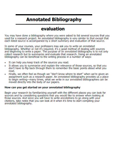 Evaluative Annotated Bibliography - An annotated bibliography is a list of source references that includes a short descriptive text (an annotation) for each source. It may be assigned as part of the. An annotated bibliography is a list of citations (references) to books, articles, and documents. This handout will explain why annotated bibliographies are useful for researchers, provide an explanation of what constitutes an.
